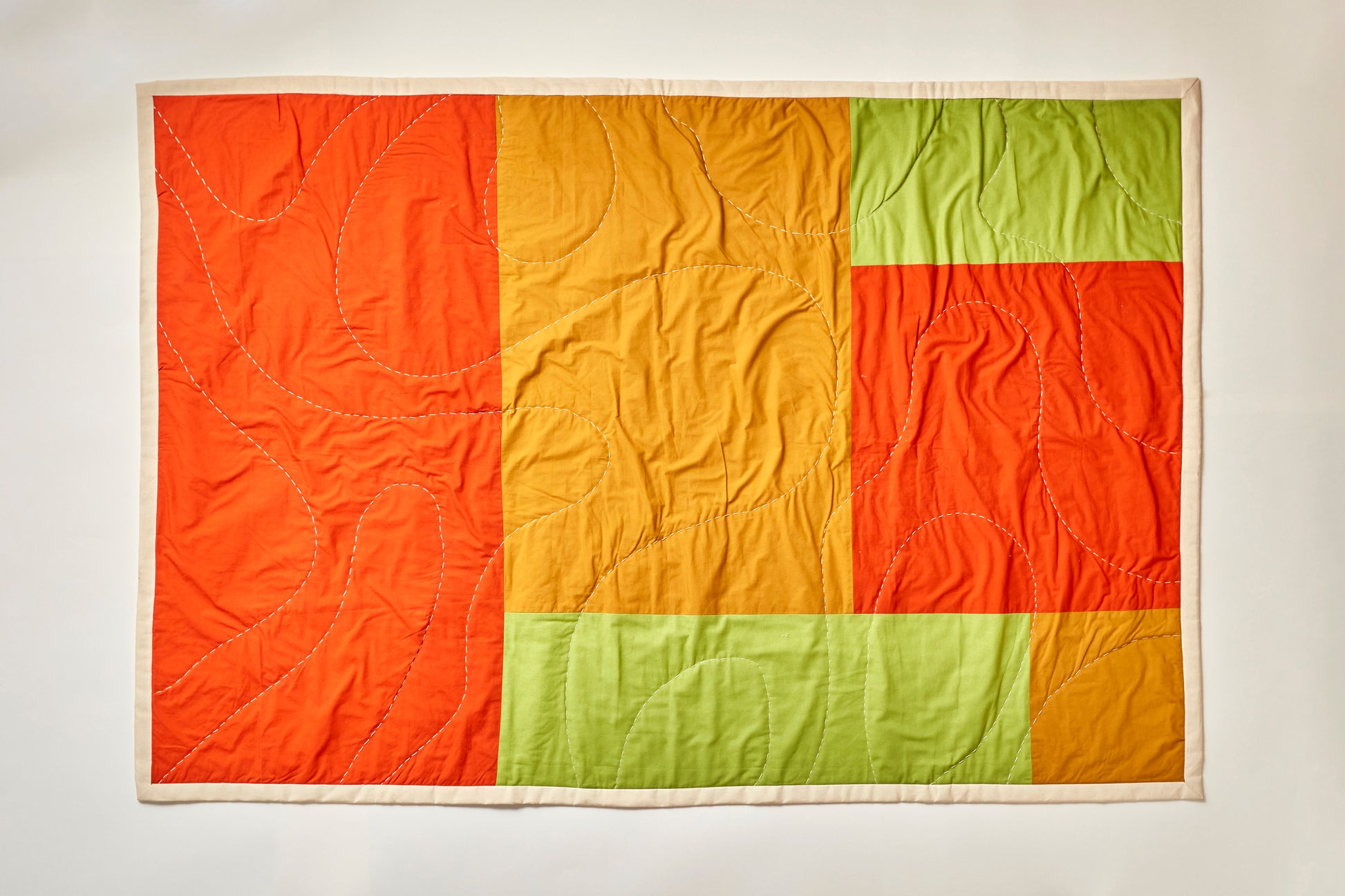 One-of-a-kind quilt that can be hung from the wall or used as a throw.
